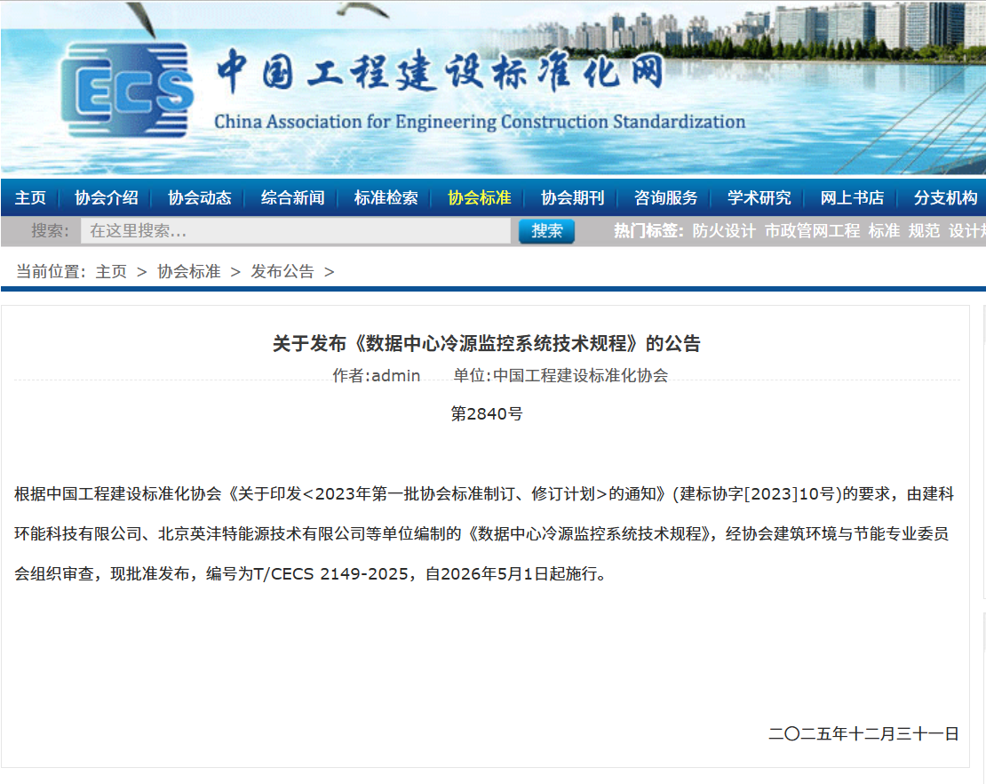 近日,根据中国工程建设标准化协会《关于印发<2023年第一批工程建设协会标准制订、修订计划>的通知》(建标协字〔2023〕10号)的要求,由建科环能科技有限公司、北京英沣特能源技术有限公司(简称“英沣特”)主编,联合多家科研院所、设计单位及行业龙头企业共同编制的《数据中心冷源监控系统技术规程》(编号:T/CECS2149-2025),经协会建筑环境与节能专业委员会组织审查正式批准发布,自2026年5月1日起施行。